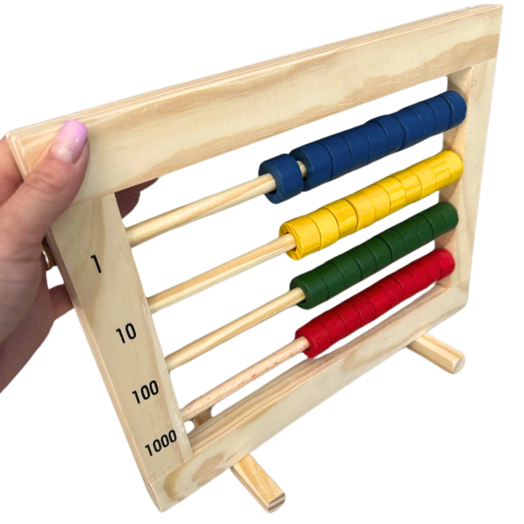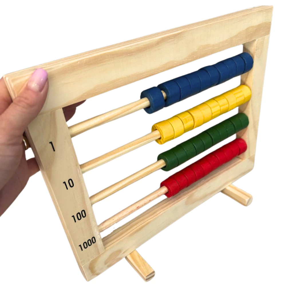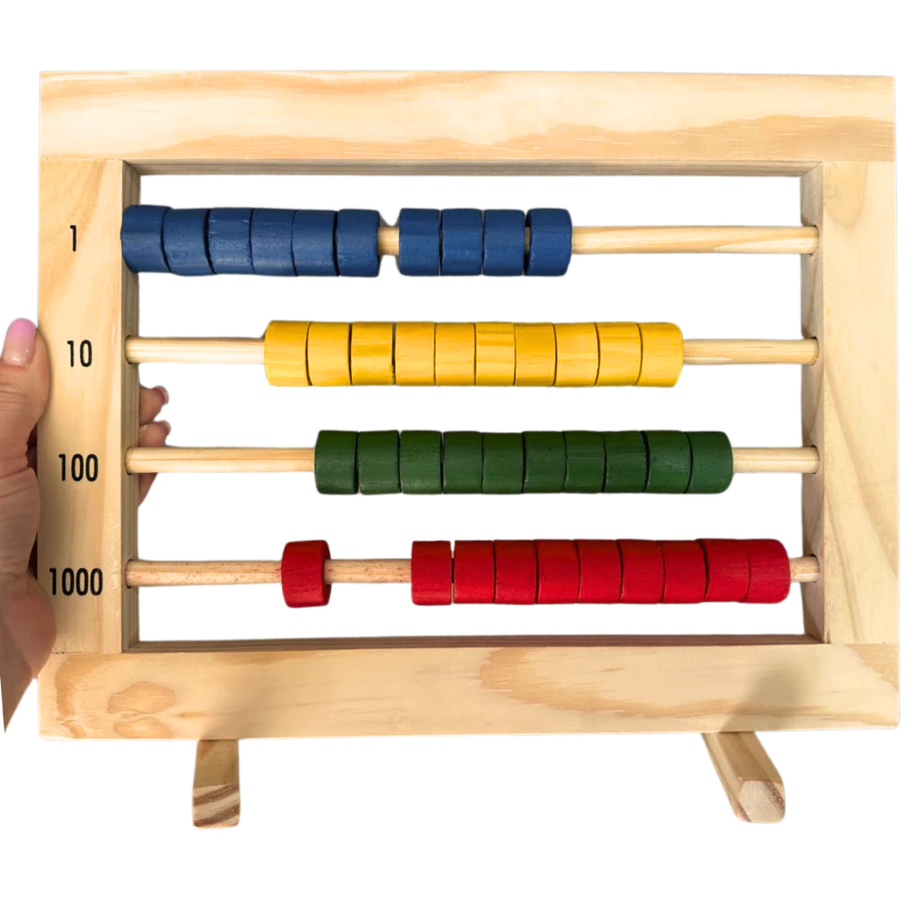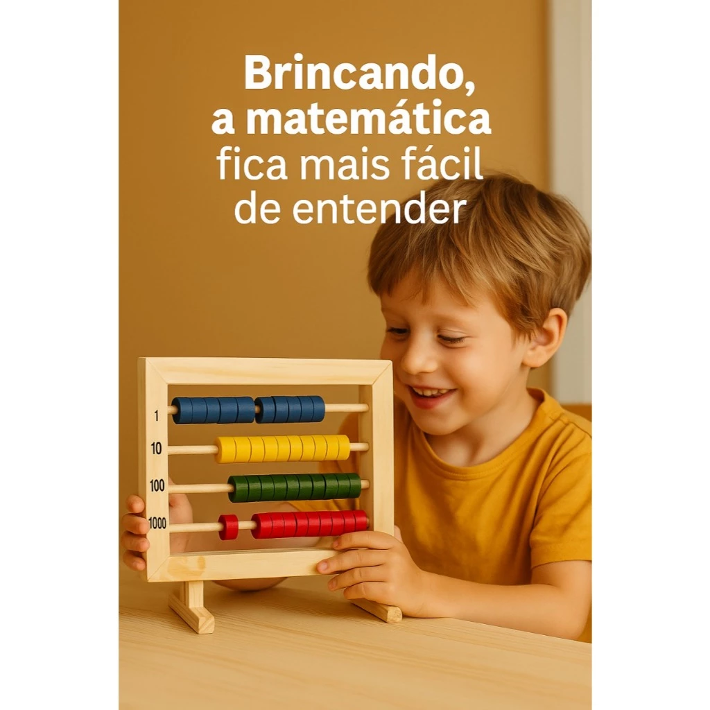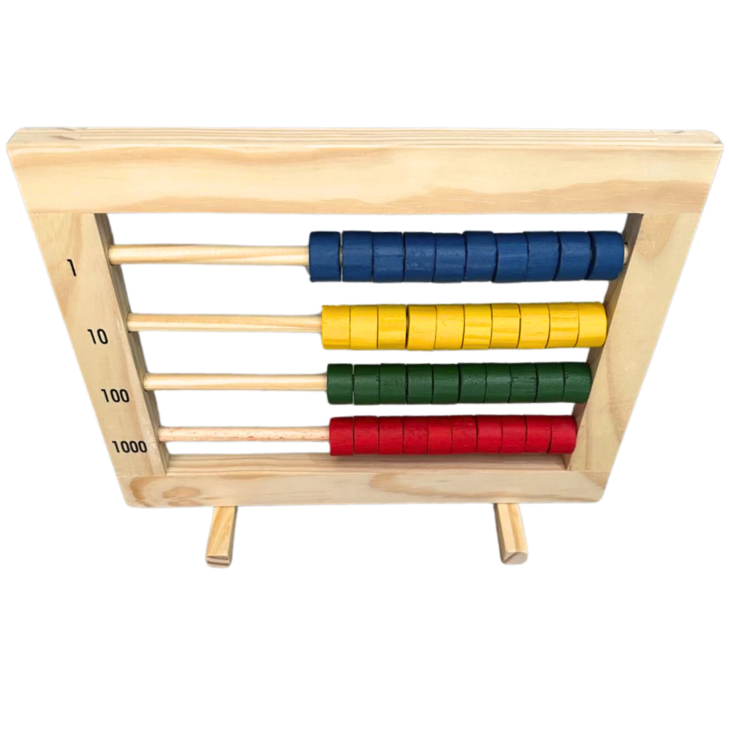 O Ábaco Fechado é confeccionado em base de madeira, com marcação de 1 -10-100-1000 (unidade, dezena, centena e milhar) com quatro hastes contendo 40 argolas em madeira coloridos, para auxiliar a criança no processo de abstração do conceito de quantidade.