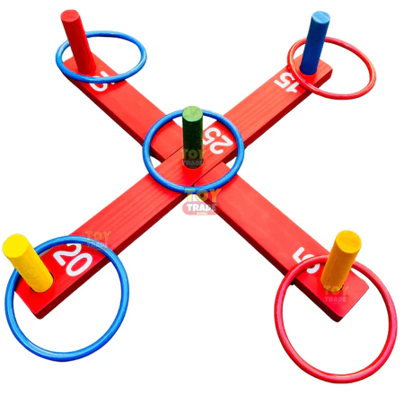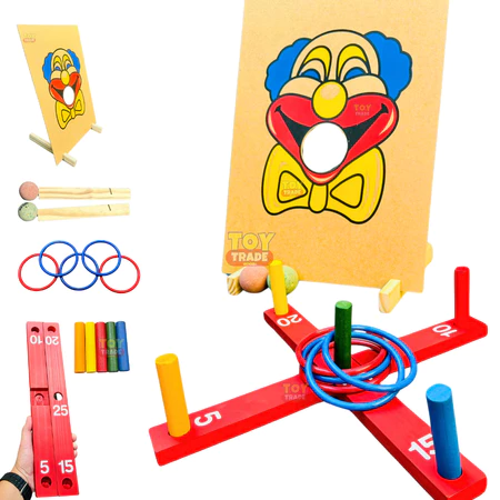 Os movimentos necessários para que se encaixem argolas nos pinos, jogadas de uma certa distância, assim como a bola na “boca do palhaço bocão” exigem das crianças coordenação viso-motora, controle da força muscular e organização espacial. pode ser jogada individualmente ou em grupo como um jogo de competição.
