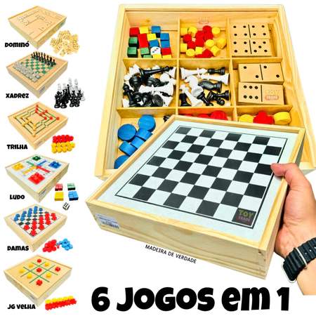 Conjunto contendo seis jogos: 6X1 (seis jogos de tabuleiro em um estojo de madeira)